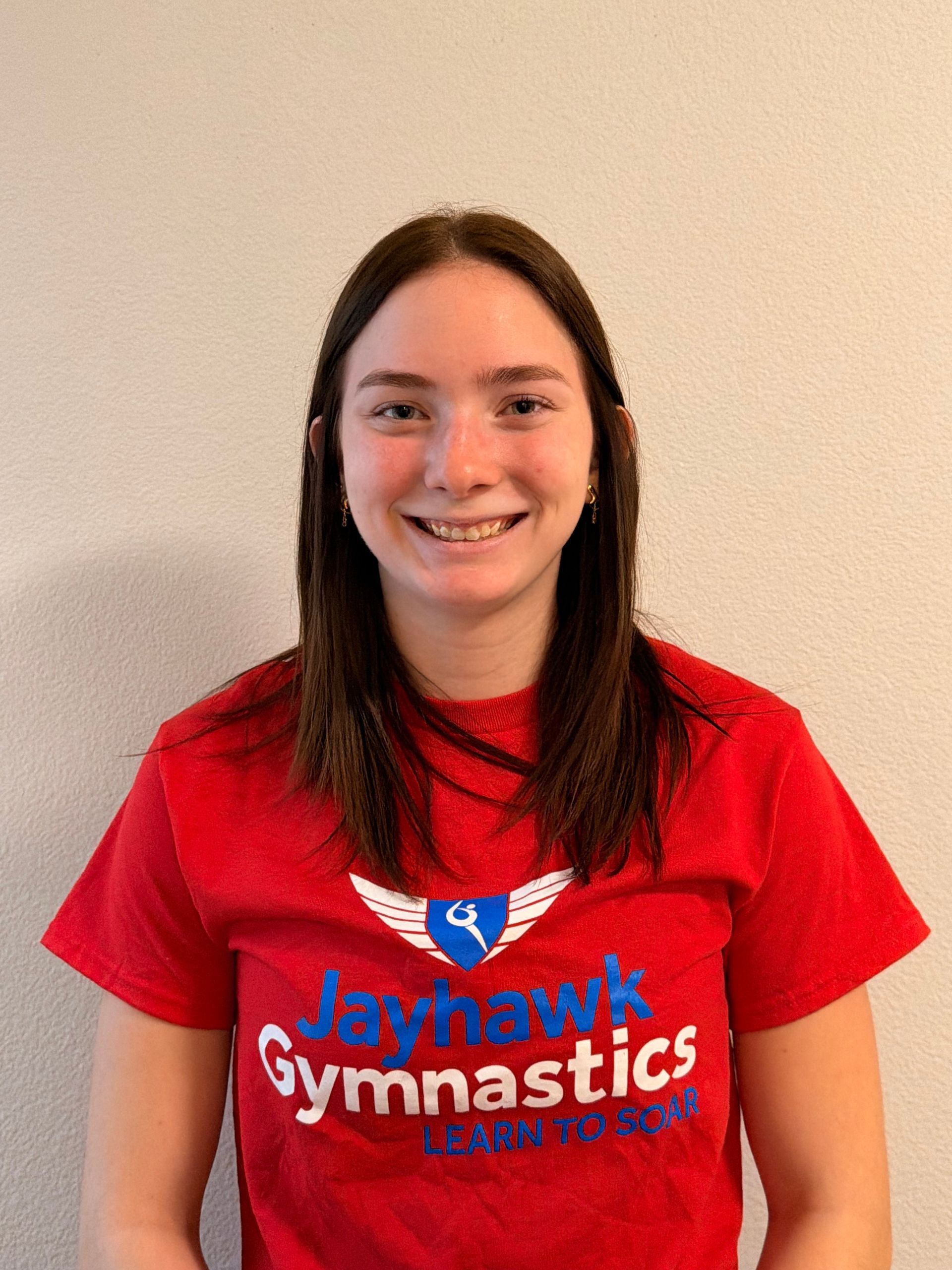 Hi, I’m Cleo! I’ve been coaching at Jayhawk since 2025. I’m currently a sophomore in high school at Free State, and plan on working at Jayhawk until I leave for college. I have been doing gymnastics for three years and am currently on the platinum level team here!